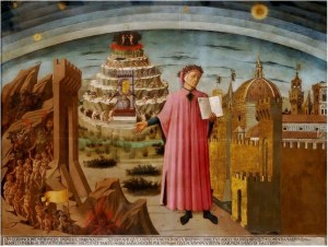 Image: Dante holding the Divine Comedy with scenes from the Divine Comedy and Florence in the background. Fresco by Domenico di Michelino, Florence, Cathedral of Santa Maria del Fiore. Image sourced from Wikimedia Commons.