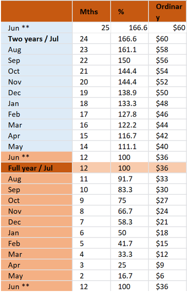 You can pay for more than 12 months if you’d like – in fact, it is cheaper to do so! Simply look at the blue section of the table above, and refer to the current month. This will show you how many months are payable, and how much it will cost.